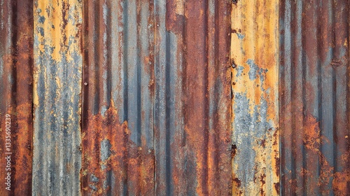 Weathered Metal Texture: An aged corrugated metal surface with rust and discoloration exhibits the passage of time through textures and tones. An ideal visual to represent industrial wear, decay.