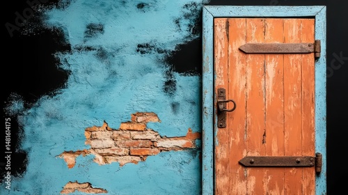 Weathered Orange Wooden Door Against Peeling Teal Wall