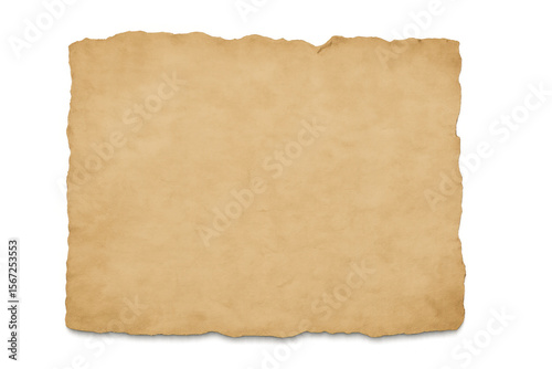 Weathered parchment sheet featuring ragged edges, resting on transparent backdrop, offering pristine area for creative text placement