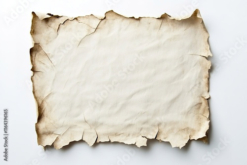 weathered piece of parchment with jagged edges placed on stark white background for nostalgic effect
