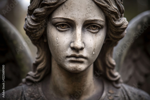 Weathered stone angel statue weeps tears of death in cemetery emotional close-up serene environment