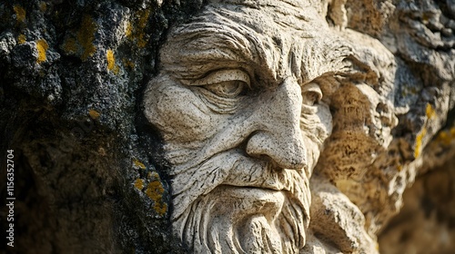 Weathered stone carving of an old man's face, partially embedded in rock.