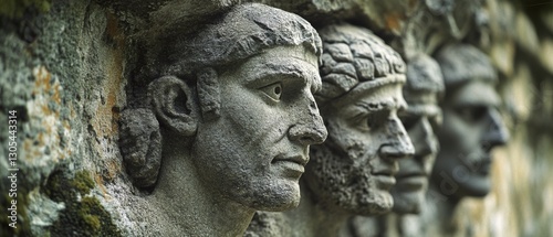 Weathered stone faces stand silently, etched with time, exuding solemnity and history in their ancient expressions.