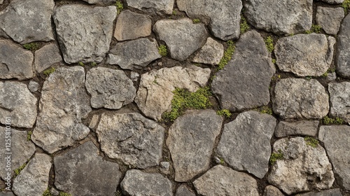 Weathered stone surface with cracks and moss plant composition background
