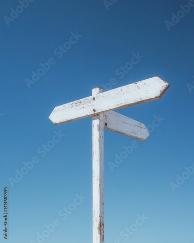 Weathered white wooden direction signpost against a clear blue sky offering guidance and choices under sunlight with a bright background