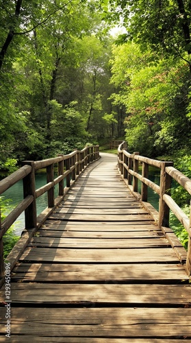 Weathered wooden bridge spanning a river or stream , outdoor landscape, rustic structure