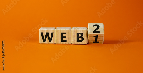 WEB 1 or 2 symbol. Turned a wooden cube and changed words WEB 1 to WEB 2. Beautiful orange table, orange background, copy space. Business, technology and WEB 1 or 2 concept.
