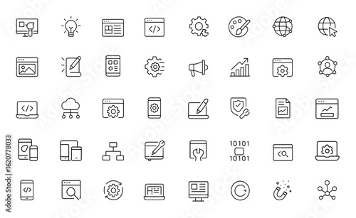 web development icon set, design, and coding. Includes digital artwork, creativity, responsive website, software, marketing, technology, portfolio, network and more