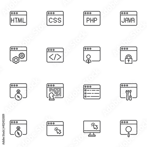 Web development line icons set, outline vector symbol collection, linear style pictogram pack. Signs, logo illustration. Set includes icons as developer, coding content, website hosting, HTML code