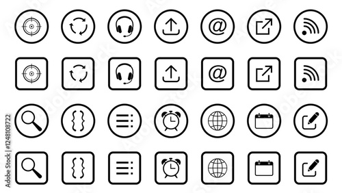 Web icon set. Target; headphones; arrow; email; internet; wi-fi; magnifying glass; brackets; menu; globe; Vector illustration