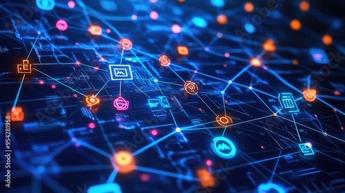 Web of digital symbols and nodes over a tech-inspired background, symbolizing virtual connections, no people