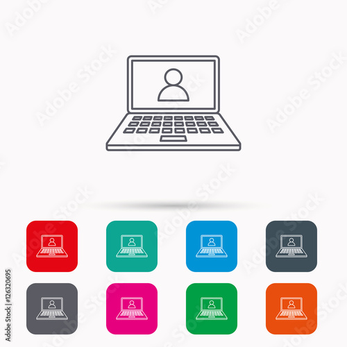 Webinar icon. Chat video sign. Online education symbol. Linear icons in squares on white background. Flat web symbols. Vector