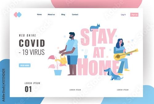 Website landing page about home quarantine concept design. Stay at home. People enjoy home activity. playing guitar, take care plants. Vector illustration