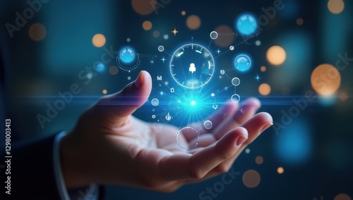 Website Personalization. Businessman hand holding glowing clock hologram, time management concept for productivity, digital future technology, office background with bokeh lights and blue tone, innov