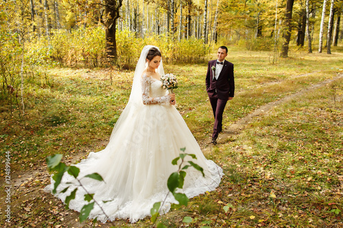 Wedding autumn. Bride and groom walking in the yellow amnal forest after their wedding ceremony