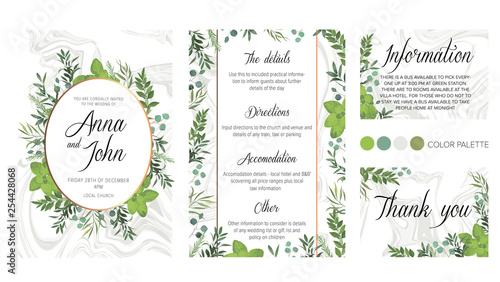 Wedding floral invite, details, rsvp, thank you label save the date card: rosemary, eucalyptus branches wreath on white marble texture with a golden geometric pattern. All elements are isolated