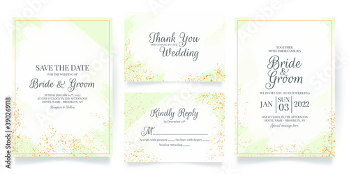 wedding invitation card template set with abstrack watercolor background and tropical leaves