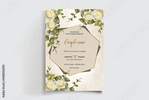 WEDDING INVITATION FRAME WITH FLOWER DECORATIONS AND FRESH LEAVES