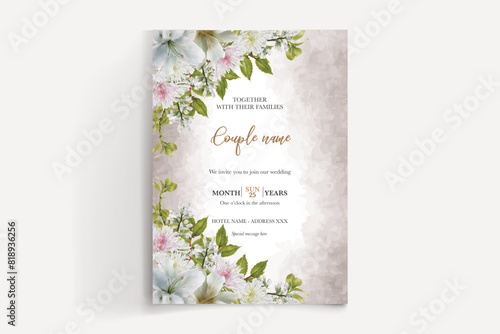 WEDDING INVITATION FRAME WITH FLOWER DECORATIONS AND FRESH LEAVES