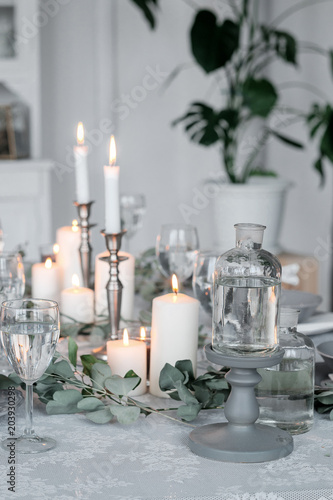 Wedding or festive table setting. Plates, wine glasses, candles and cutlery