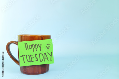 Welcome, hello and happy Tuesday concept. Selective focus of coffee cup with written message isolated in blue background.