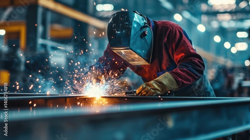 Welder fusing metal beams at an industrial site. Featuring high-intensity precision welding and sparks