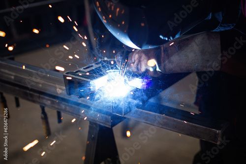 welder, mig or tig welding, craftsman, erecting technical steel Industrial, pretty sparks from weld pistol, steel welder in factory technical