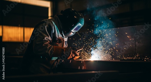 Welder sparks illuminate industrial scene, protected by safety gear