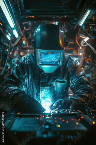 Welder working in a factory workshop with protective gear, sparks flying, and bright lighting in an industrial setting focused on metal welding and safety equipment