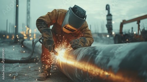 Welder working on a pipeline construction project, welding large pipes with precision tools outdoors