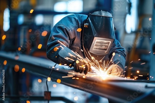 Welder working with protective mask welding metal in the factory. Metalwork manufacturing and construction concept