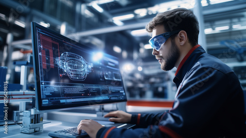 Welding Automation in Industry 4.0: An intelligent automotive factory scene featuring an engineer using software to control robotic arms, demonstrating advanced digital manufacturi