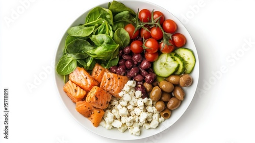 Wellness plate featuring Mediterranean diet elements, known for longevity, artistic presentation, isolated on white background