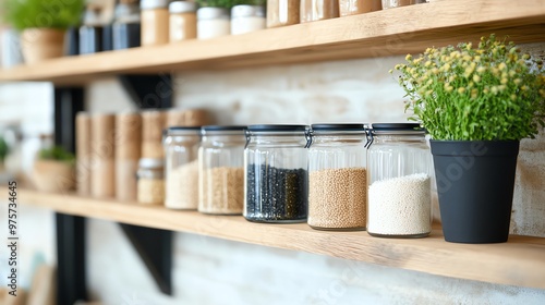 Well-organized kitchen shelf with jars of spices and a potted plant, featuring a modern and minimalist design.