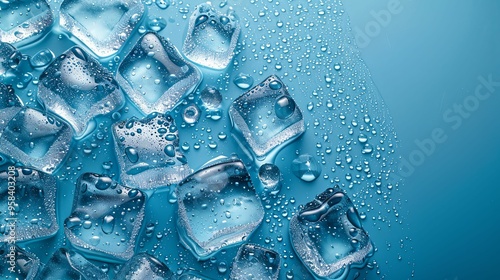 Wet Ice Cubes on a Blue Background with Water Droplets