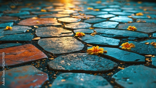 Wet stone pavement with scattered yellow flowers and leaves under soft evening light