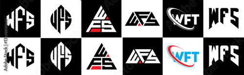 WFS letter logo design in six style. WFS polygon, circle, triangle, hexagon, flat and simple style with black and white color variation letter logo set in one artboard. WFS minimalist and classic logo