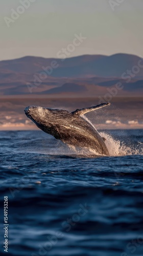 Whale breaching ocean surface with spray arcs on a softly blurred horizon backdrop under bright sky light