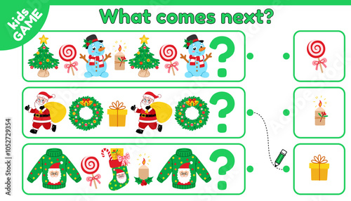 What comes next is. Christmas educational kids game. Choose objects, complete pattern. Puzzle for children with Santa Clauses, snowmen, holiday spruce wreaths, Xmas trees. Baby activities page. Vector
