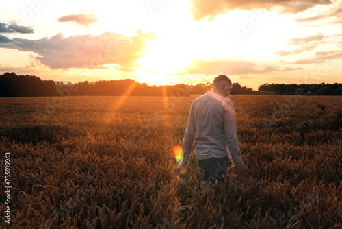 Wheat field at sunset. Agriculture concept, a farmer in the field checks the quality of the crop. Front view