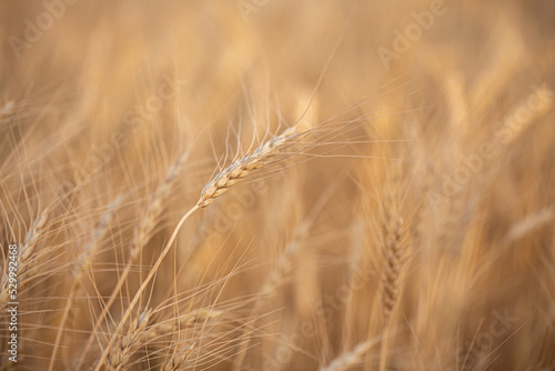 Wheat field on a sunny day. Grain farming, ears of wheat close-up. Agriculture, growing food products.