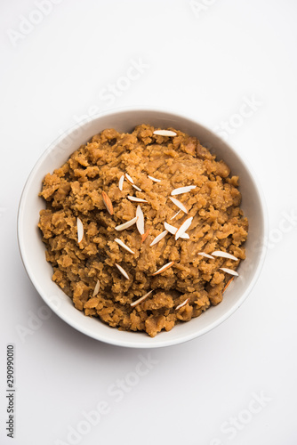 Wheat flour Halwa or Shira / Atte ka Halva, Popular healthy dessert or breakfast menu from India. served in a bowl or plate. selective focus