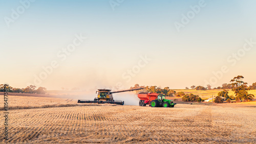 Wheat harvesting combine at work in the field offloading grain into following trailer, Barossa Valley, South Australia