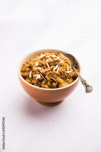 Wheat Laapsi/Lapsi/Shira/Halwa is an Indian sweet dish made of broken wheat or Daliya pieces and ghee along with nuts, raisins and dried fruits. It's a healthy food. served in a bowl, selective focus