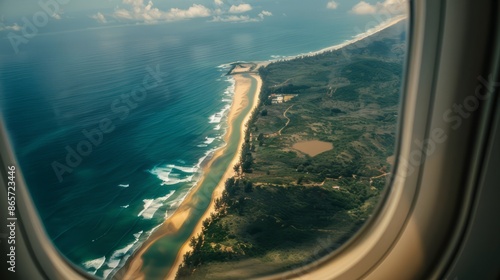 When looking out of the airplane window, the view from above features a beautiful and mesmerizing beach.