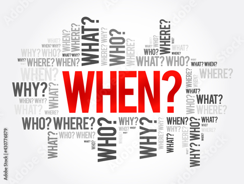 WHEN? Question and Questions whose answers are considered basic in information gathering or problem solving, word cloud background