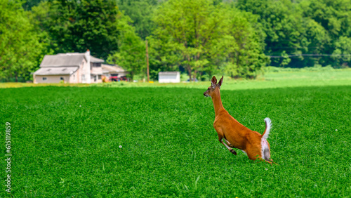 While driving the road by our house this female deer, a doe, bounds across the street and into the grass-covered field. With no effort this animal bounds feet into the air while running away from me.