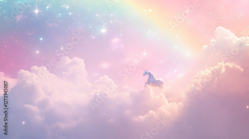 whimsica pastel rainbow unicorn background shines with sparkling stars against a soft, pink fantasy sky. Fairy iridescent gradient backdrop. unicorn resting on a fluffy cloud with a vibrant rainbow
