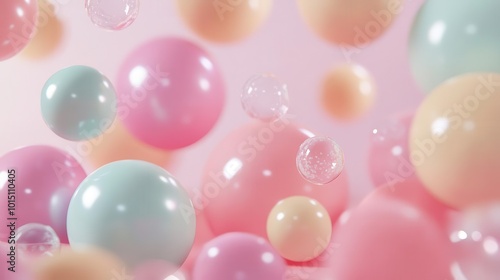 whimsical 3d illustration of pastel-colored balls and bubble gum. soft, dreamy atmosphere with playful composition. candy-like textures and subtle shadows.