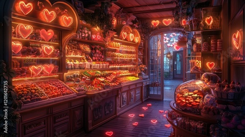 Whimsical Candy Shop Filled with Glowing Heart Shapes and Treats